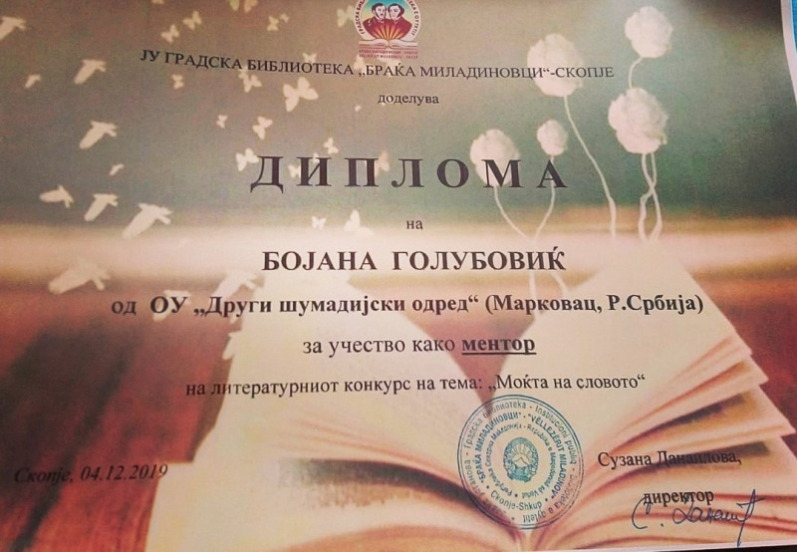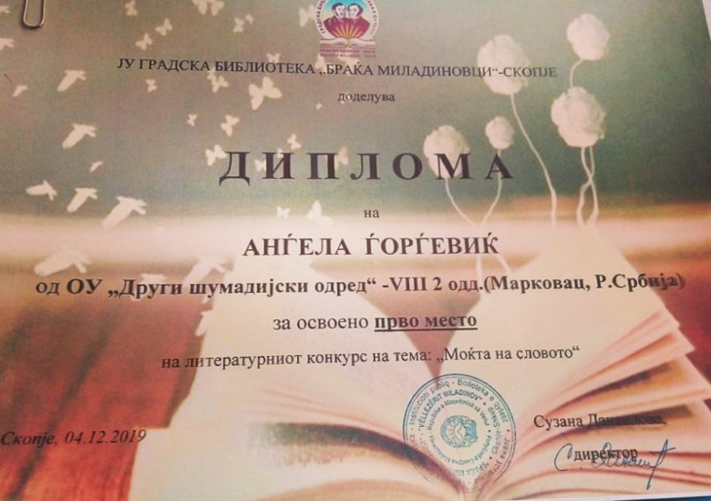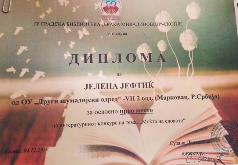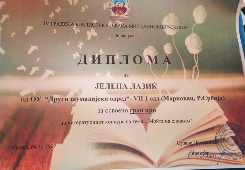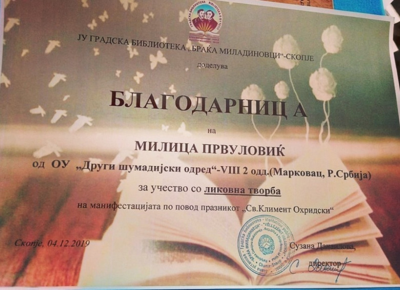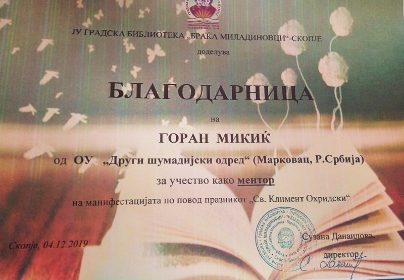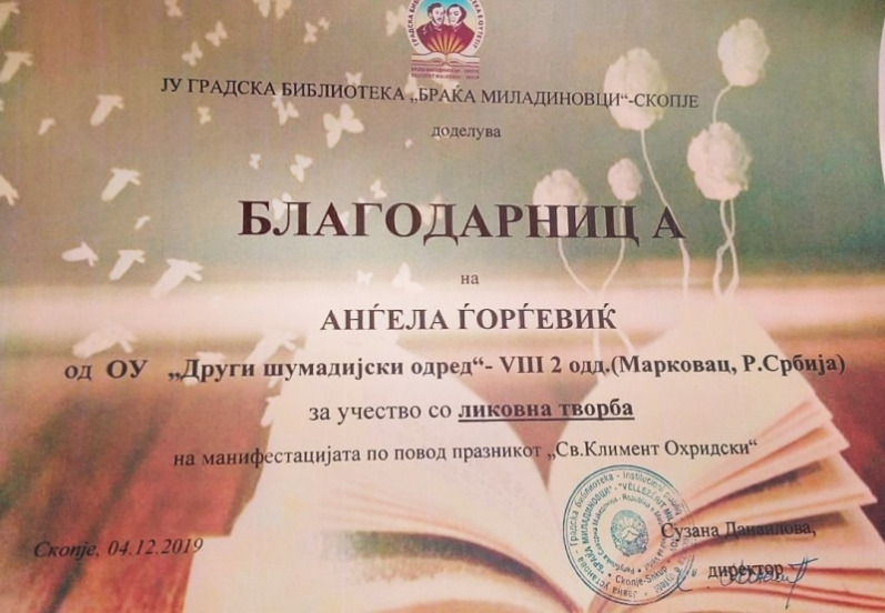 4. децембра су у градској библиотеци ''Браћа Миладиновци'' у Скопљу додељене награде за најбоље литерарне и ликовне радове, поводом државног празника који се у Републици Северној Македонији прославља у част св. Климента Охридског. Литерарни радови наших ученика су сви првонаграђени, при чему је Јелена Лазић освојила ''гран при'', а Јелена Јевтић и Анђела Ђорђевић деле прво место. Бојана Голубовић је добила диплому за менторство при реализацији конкурса.